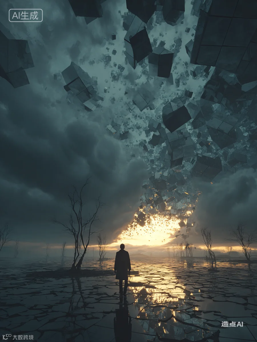 中文:这是一幅充满情感的景象:破碎的镜子反射出对逝去爱情的零散记忆;由光之藤蔓连接的漂浮岛屿;在暴风雨的天空下,一个人正拼凑着那些如拼图般的碎片。这一切都以Beeple和Rene Magritte的数字超现实主义风格呈现出来。