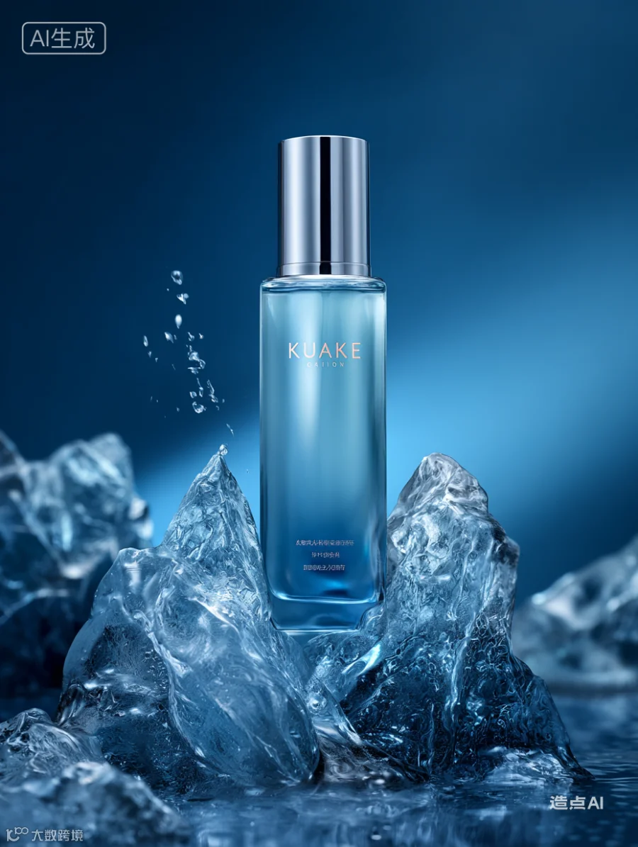 中文:男士洗护,护肤品产品摄影,男士香水商业广告,瓶身和标签上印有"KUAKE"字样,深蓝色背景,产品周围是覆盖着冰的岩石,工作室灯光,顶部工作室灯光,空中飞舞的水滴,专业色彩分级,柔和阴影,低对比度,清晰锐利对焦,杂志风格摄影。