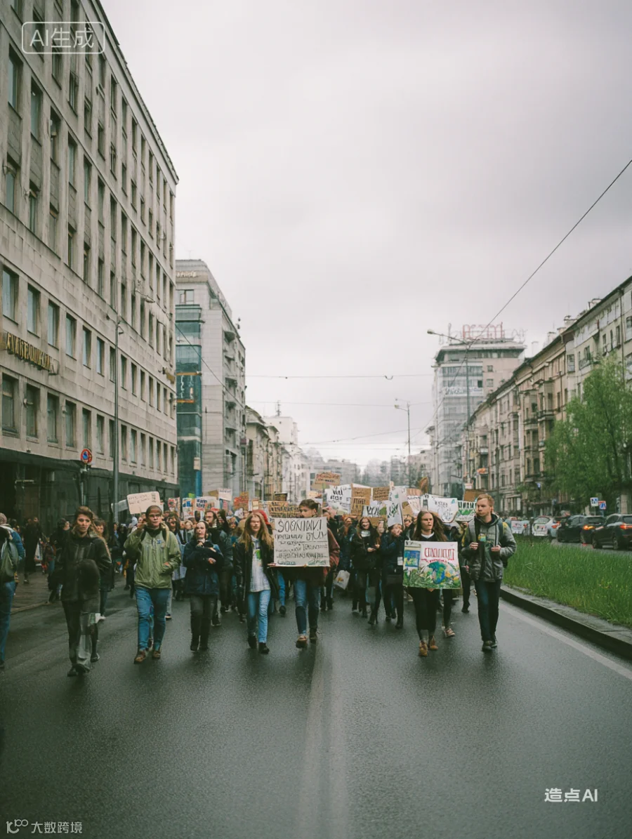 A peaceful protest march in a city avenue, diverse activists holding signs and banners for climate action, walking arm-in-arm with determined expressions, onlookers watching from sidewalks, overcast sky with light rain, in documentary photorealistic style, muted greens and grays, linear procession view.
