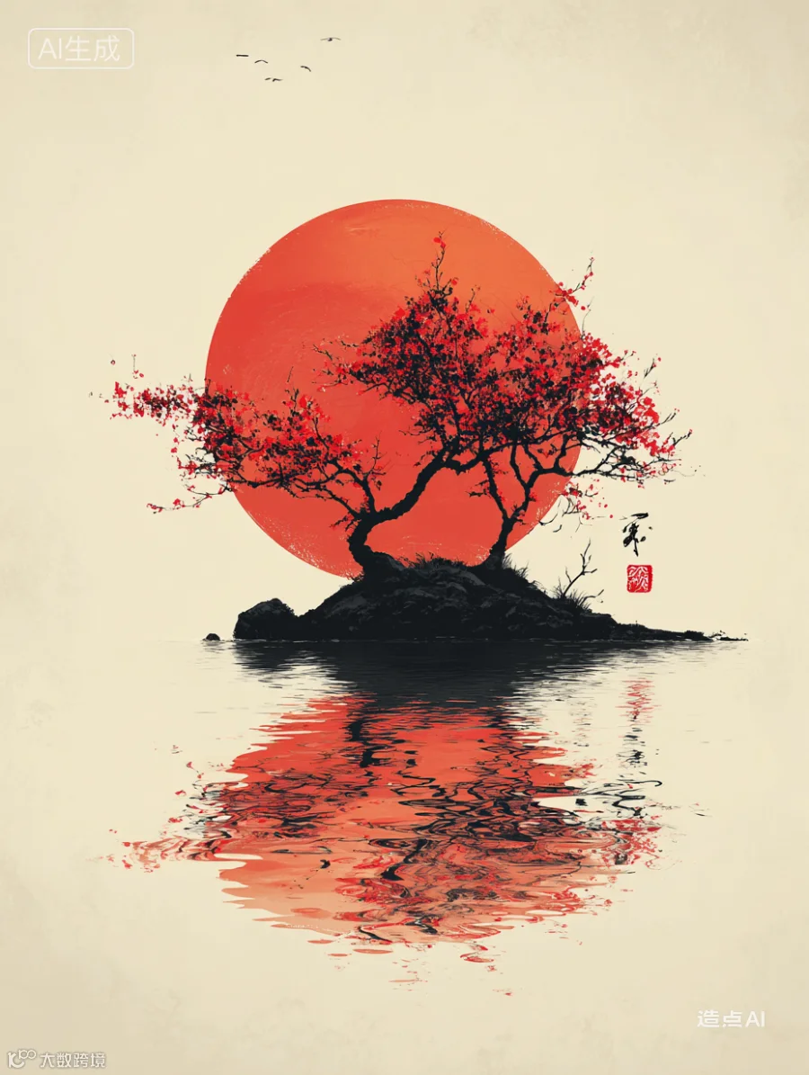 背景纯白,大大圆圆的落日,一棵树,红色和黑色,落日和树相互辉映,倒影,由浅到深,磨砂颗粒感,高级感,东方美学,简约构图,意境,杰作,16k。