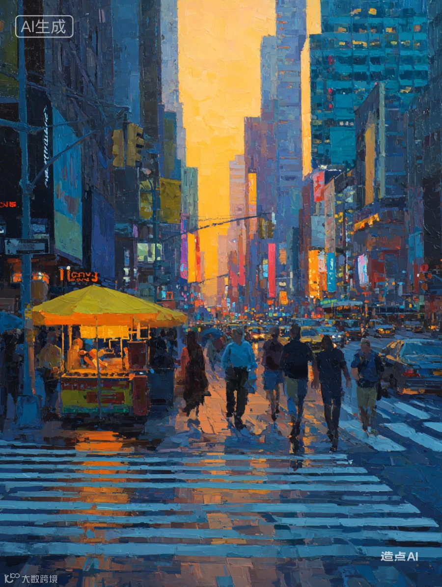 中文:黄昏时分,一条繁华的现代城市街道:行人正在人行横道上穿过斑马线,高楼上的霓虹灯闪烁着光芒;一位街头小贩在黄色雨伞下售卖热狗;被雨水打湿的路面反射着灯光。整个场景呈现超写实风格,衣物和人物的细节纹理十分精致,色彩搭配以温暖的橙色和冷色调的蓝色为主。画面是从地面视角拍摄的广角镜头。