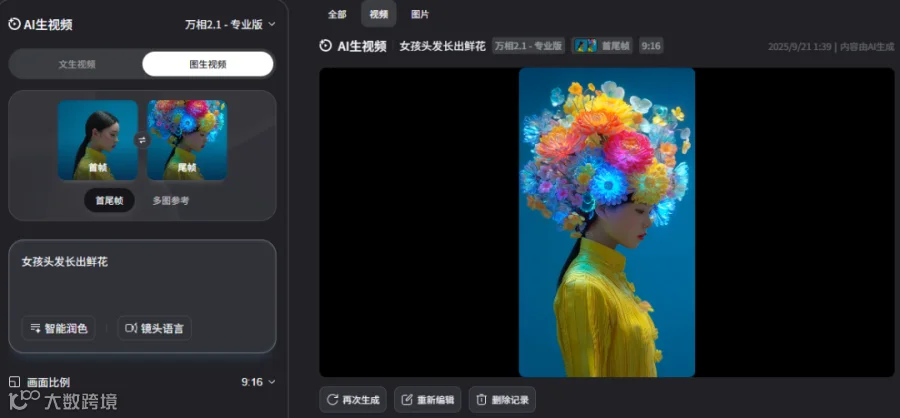 把这张图设置为尾帧,然后上传一张正常图(用banana模型去掉鲜花)作为首帧,输入提示词“女孩头发长出鲜花”。