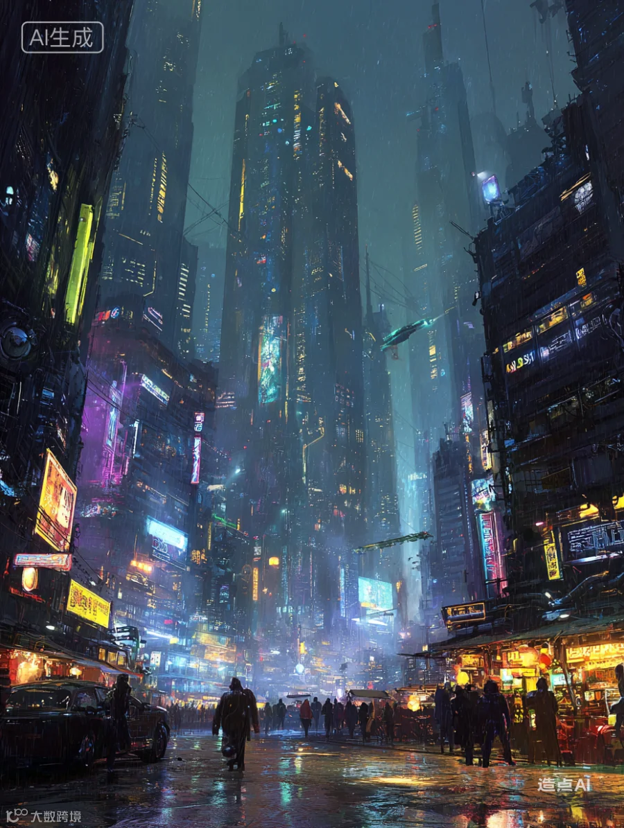 中文:午夜时分,一座充满活力的赛博朋克大都市:霓虹灯照亮的摩天大楼在雨后的街道上投下倒影;全息广告中的人工智能伙伴与行人互动;一名穿着风衣的黑客在屋顶咖啡馆里操控着一群无人机……这里融合了《银翼杀手》和《阿基拉》中的各种元素。