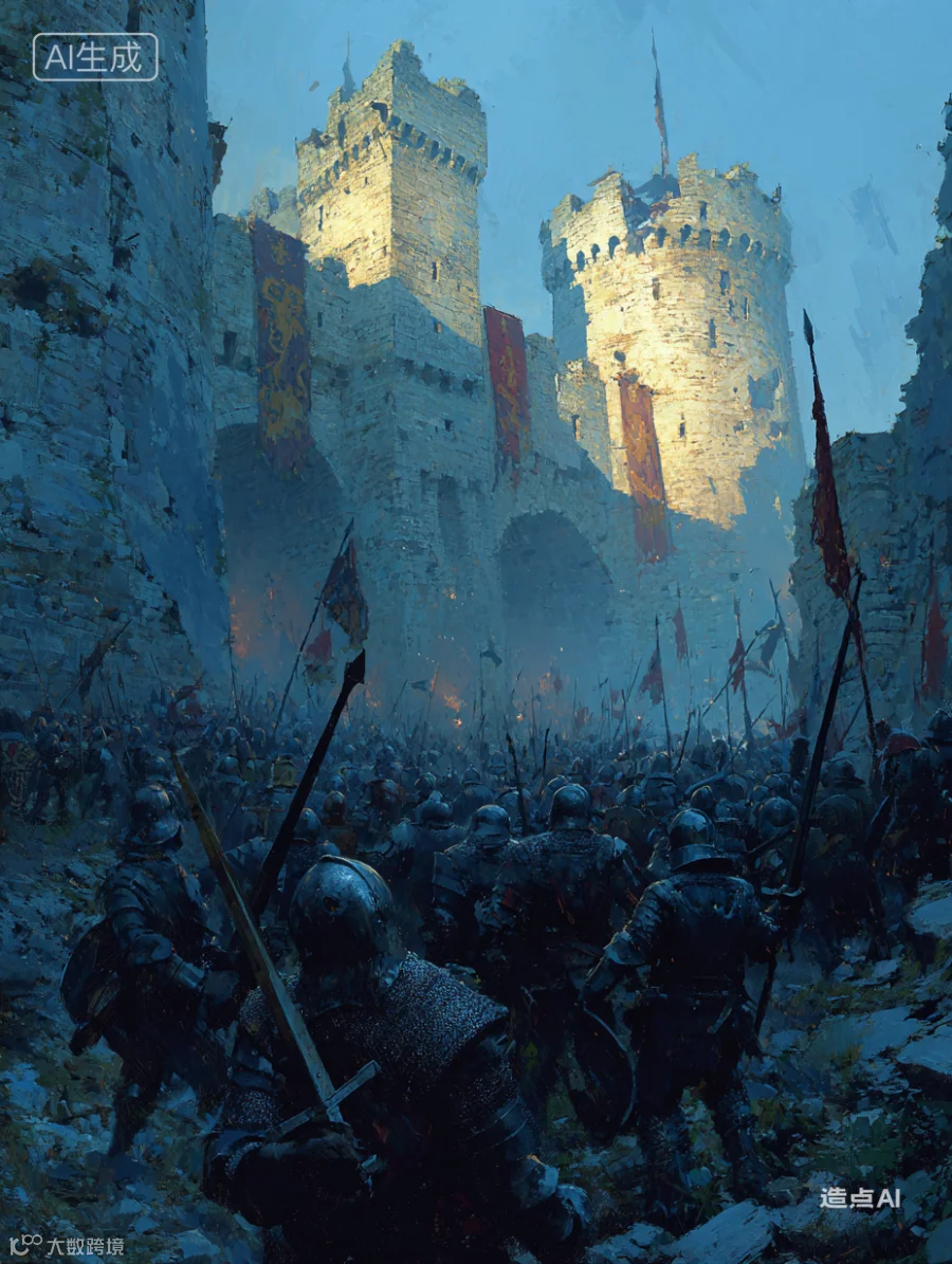 中文:黎明时分,一场宏大的中世纪战场景象:身着铠甲的骑士们在摇摇欲坠的城堡废墟中挥剑交锋;旗帜在风中飘扬,上面印着纹章图案;雾气从地面升起,隐藏着弓箭手的身影。这一切都以约翰·威廉·沃特豪斯(John William Waterhouse)和卡拉瓦乔(Caravaggio)那种极度精细的绘画风格呈现出来,同时运用了富有戏剧性的明暗对比光影效果。