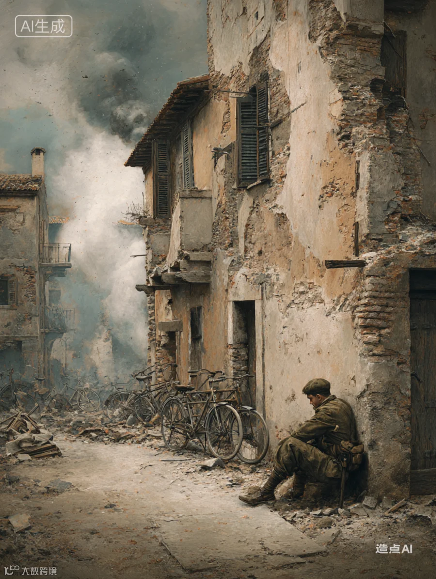 中文:1944年,一条饱受战争摧残的欧洲街道:一名身着破旧军装的士兵靠在一座被炸毁的建筑物上,周围散落着碎石和废弃的自行车;阴沉的天空下,废墟中冒出淡淡的烟雾。这幅画采用超写实的历史风格,以柔和的土色调呈现鲜明对比,采用侧面视角的构图方式来讲述故事。