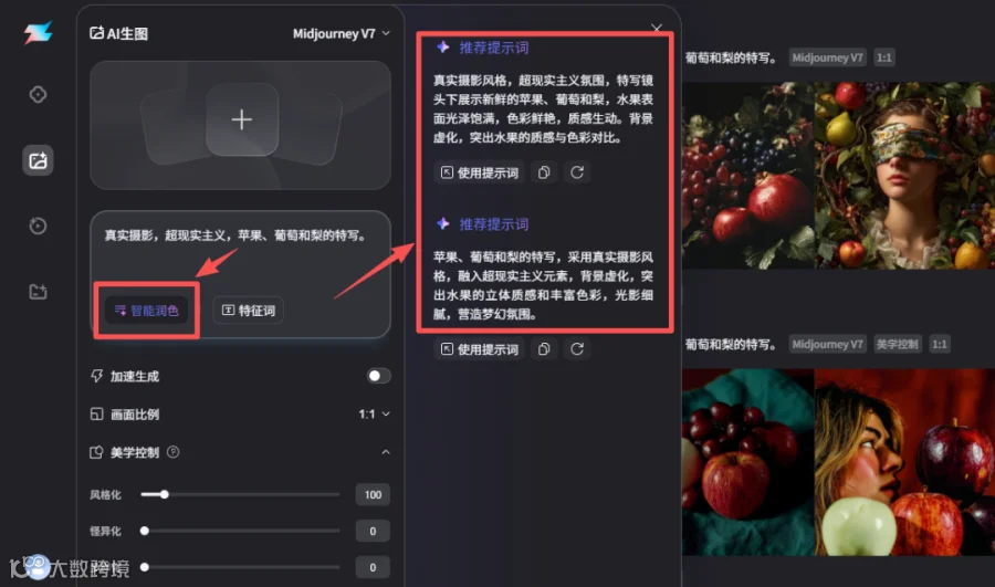 然后,针对原版Midjourney比较吃提示词的问题,「造点AI」提供了两个快捷按钮。