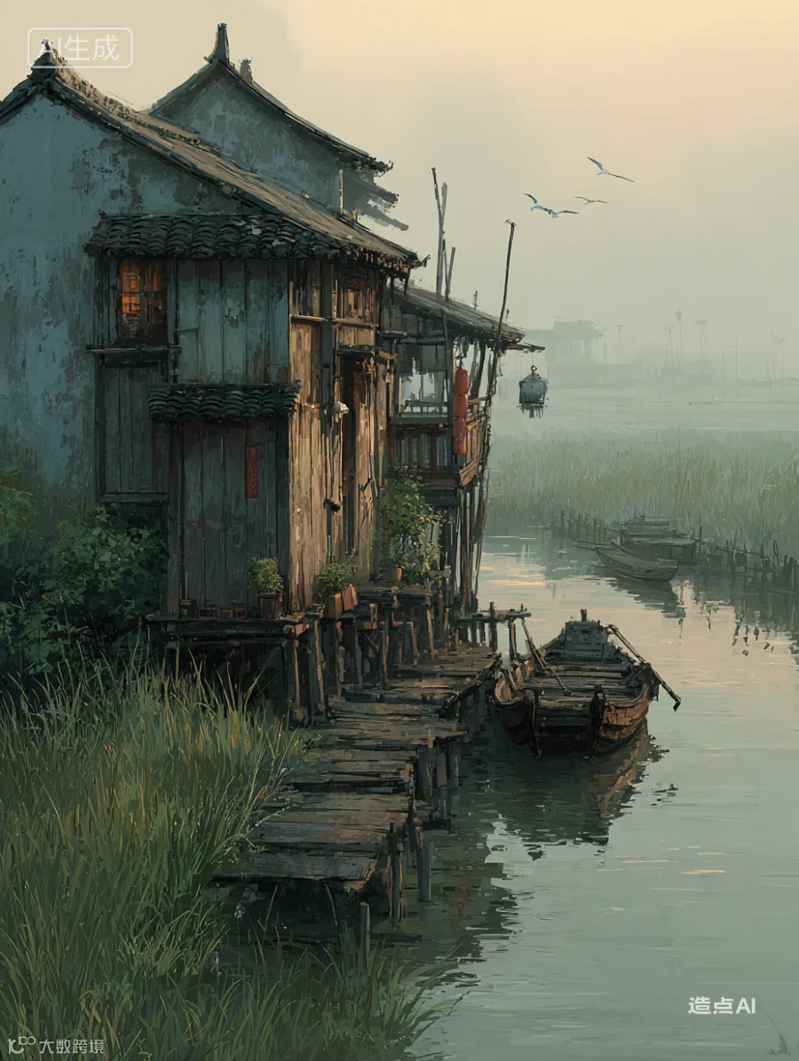 中文:黎明时分,江南的一个宁静水镇:木制船艇停泊在运河两岸,衣物晾在竹竿上;老妇人在石桥上练习太极拳;背景中雾气笼罩着稻田,白鹭在低空飞翔。这种写实风格让人联想到中国乡村的诗意——翠绿的草木、柔和的灰调,以及从船舱视角拍摄的全景水平画面。