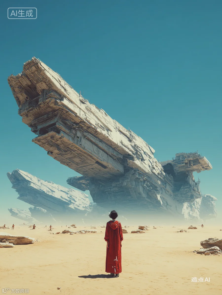 中文:太空废墟美学,科幻概念艺术,时尚摄影,环境人像。