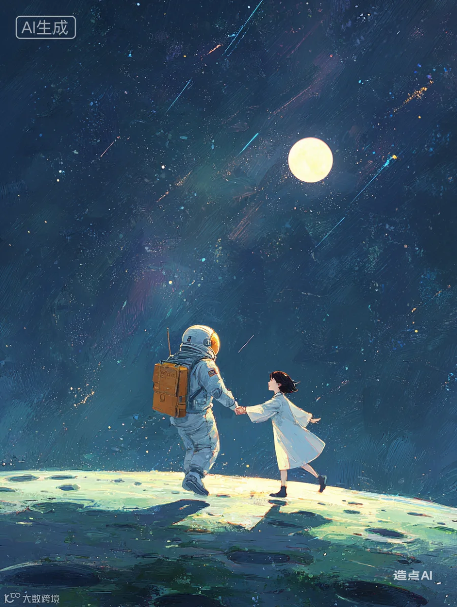 宇航员与身着古代汉服的女子,在月球表面共舞,地球悬挂在远方的天幕,星河如瀑流动,唯美插画风格,细节精致,柔和梦幻光效。