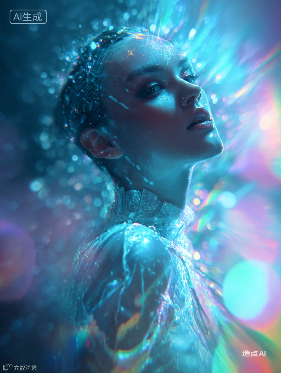 中文:弥散风格,艺术摄影,细腻光影。画面主体是白瓷质感的人像,魅力十足,顶级神颜,皮肤白到发光,霓虹色彩,充满高级感与未来感。构图精致,光斑点缀其间,营造出神秘而惊艳的画面。情绪人像,多重曝光视角,超现实主义,细节丰富,粒子效果,边沿发金光,光影流动。