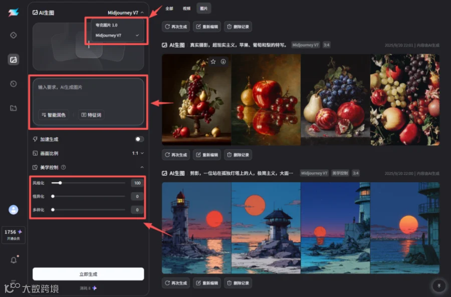 它有两个模型可选,一个是Midjourney V7,另一个是夸克图片1.0。