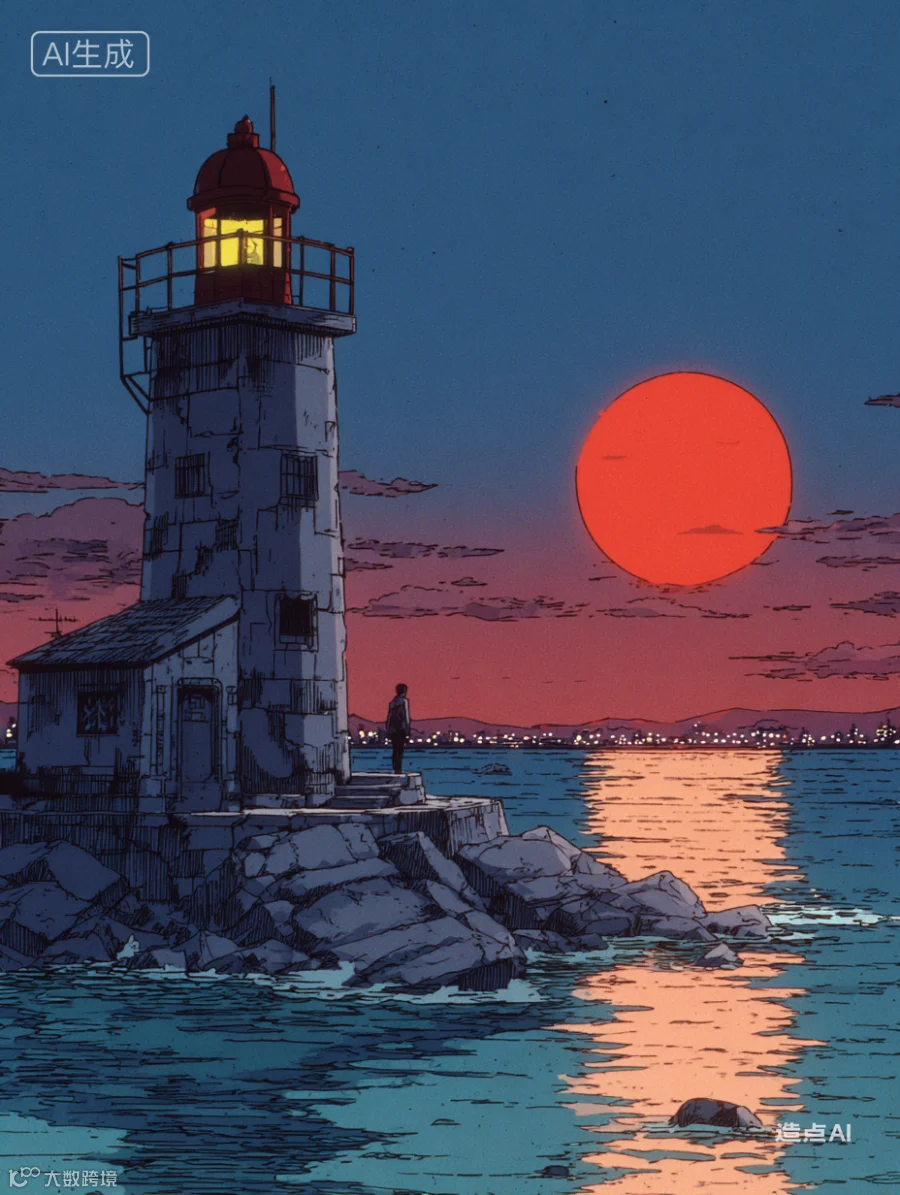 剪影,一位站在孤独灯塔上的人,极简主义,大面积留白,深蓝色海面,远处的月亮倒影,冷暖色调对比,梦幻氛围,超高分辨率。