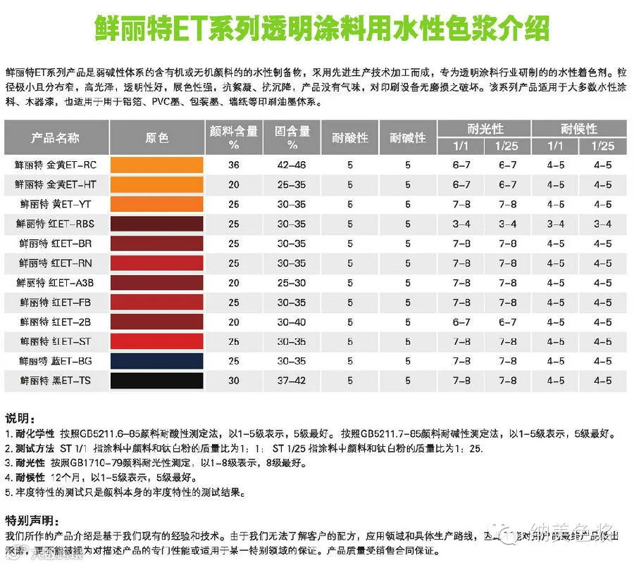 鲜丽特ET系列产品是弱碱性体系的含有机或无机颜料的水性制备物,采用先进生产技术加工而成,专为透明涂料行业研制的水性着色剂。