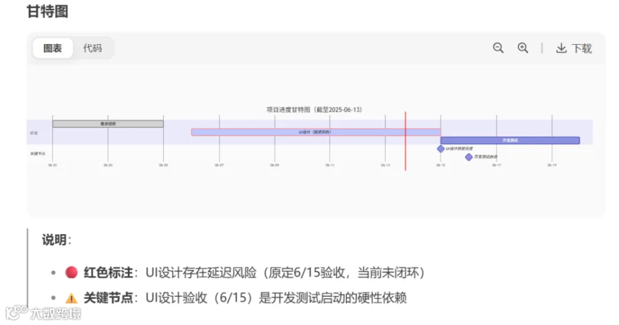 ✔ 数据可视化:加一句“将进度延迟的任务用红色标注在甘特图中”
