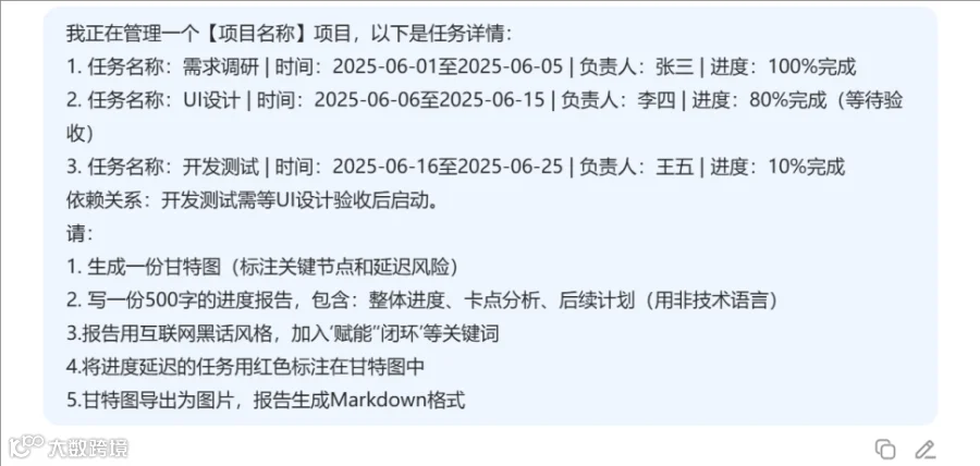 ✔ 动态更新:每周丢一句“更新进度:开发已完成90%”,AI会自动调整甘特图和报告