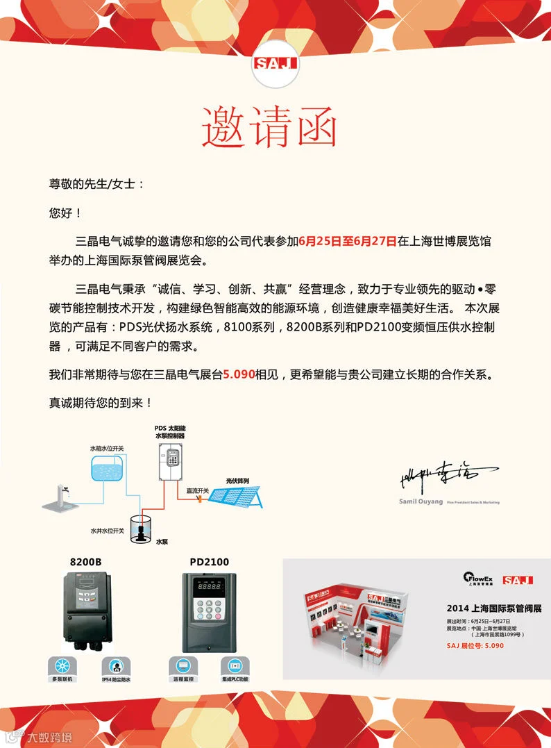 导读:三晶电气诚挚的邀请您和您的公司代表参加在上海世博展览馆举办的上海国际泵管阀展览会。