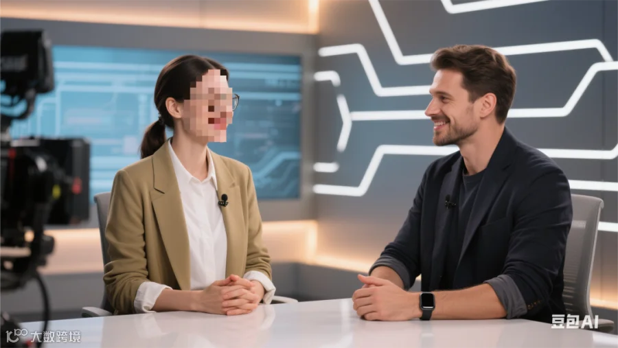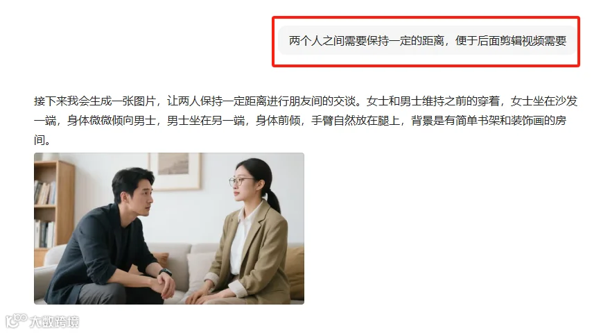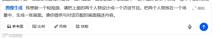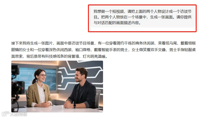 然后输入提示词:我想做一个短视频,请把上面的两个人物设计成一个访谈节目。把两个人物放在一个场景中,生成一张画面。请你提供与对话匹配的画面描述内容。