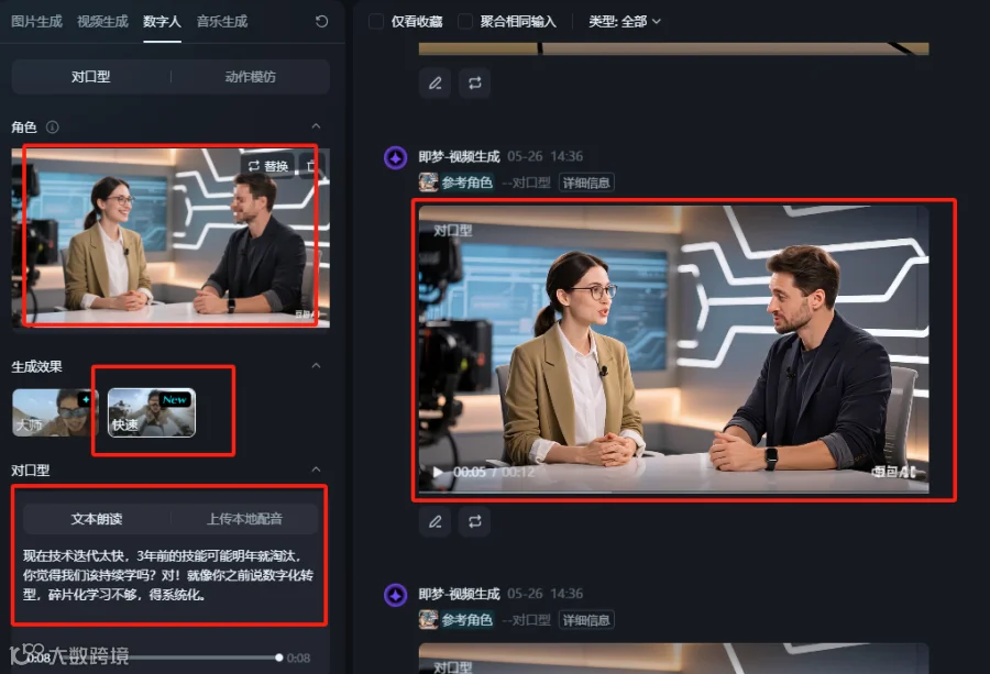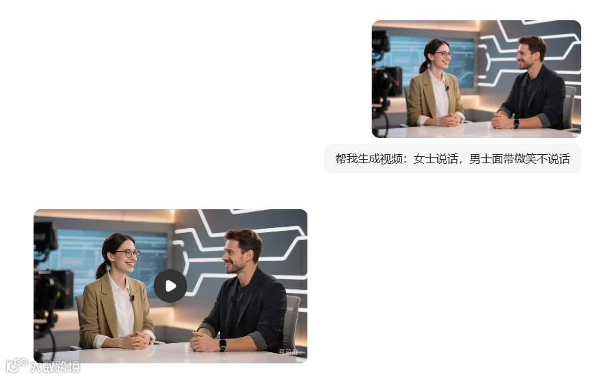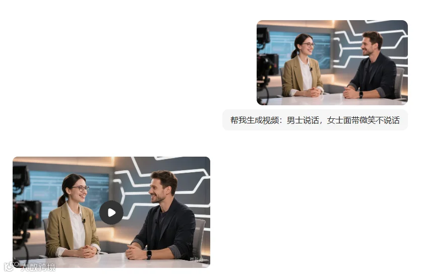 注:这一步,我也先在豆包中生成了视频,按照之前动漫对口型视频方法,分别生成男士说话,女士不说话的片段。