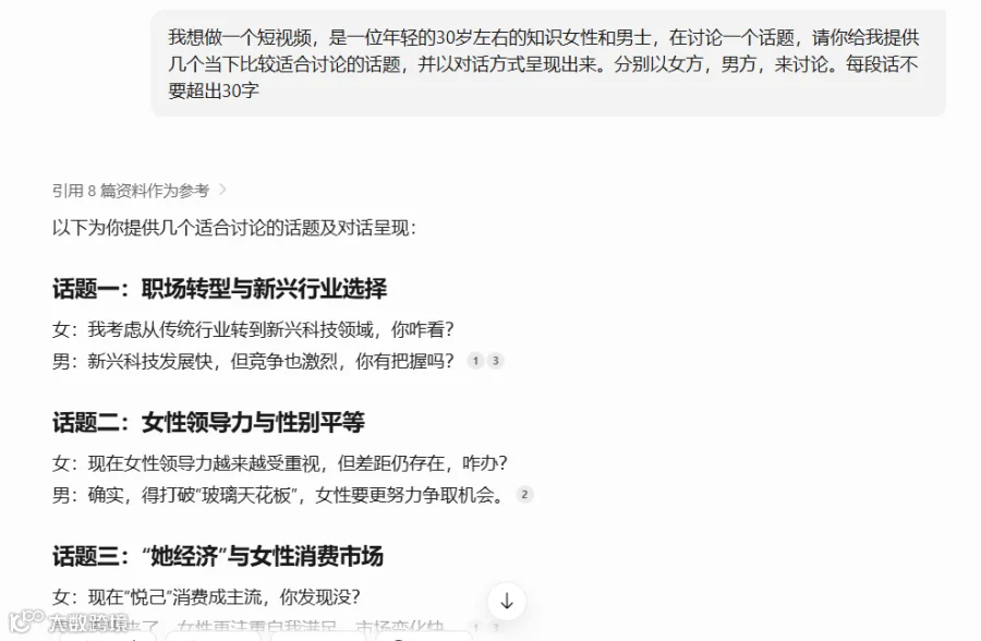 输入提示词:我想做一个短视频,是一位年轻的30岁左右的知识女性和男士,在讨论一个话题,请你给我提供几个当下比较适合讨论的话题,并以对话方式呈现出来。分别以女方,男方,来讨论。每段话不要超出30字