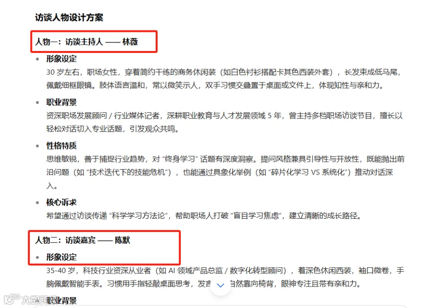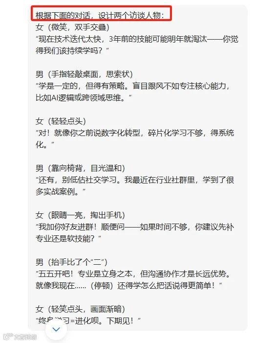 1、打开豆包,把上面选好的文案,复制到豆包对话框中,要求豆包根据下面的对话,设计两个访谈人物。