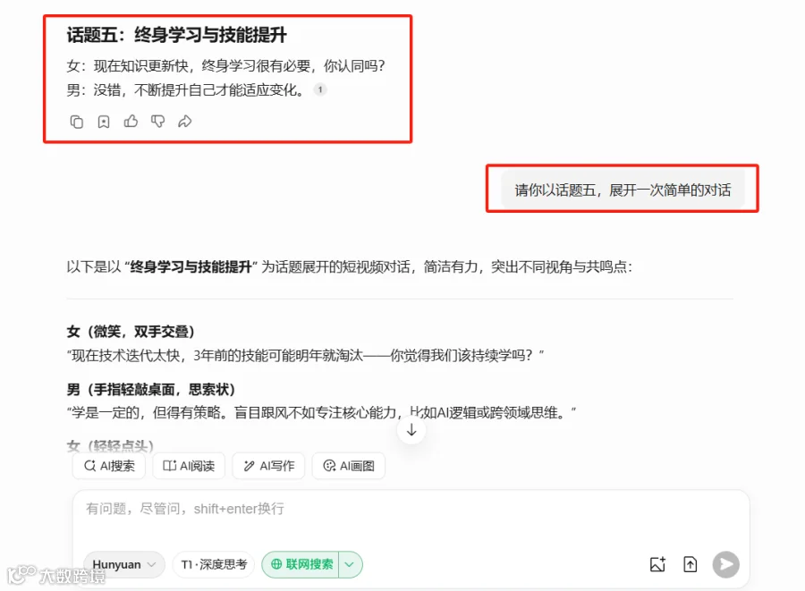 以下是以 “终身学习与技能提升” 为话题展开的短视频对话,简洁有力,突出不同视角与共鸣点:
