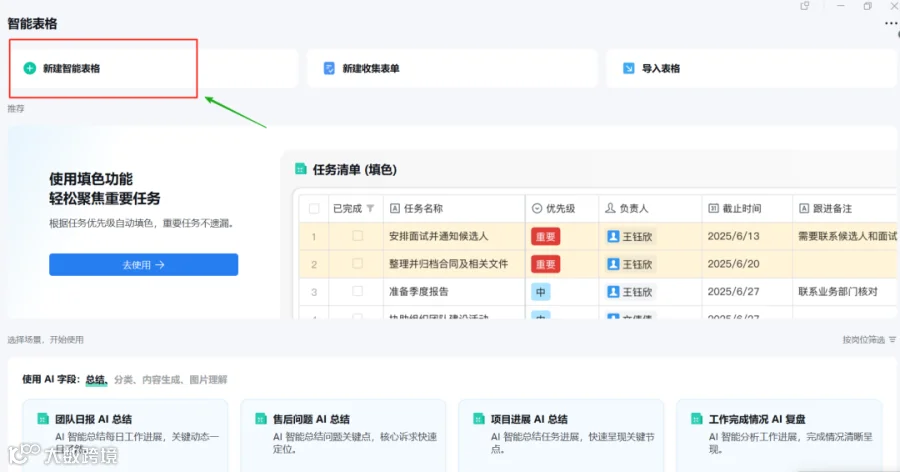 - 智能表格:在左侧菜单栏直接点击体验
