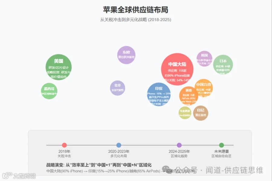 2018年的关税冲击成为了苹果加速其供应链多元化战略的重要催化剂。关税战的爆发,叠加后续新冠疫情对全球供应链的扰动,凸显了过度依赖单一国家生产的风险,促使苹果将多元化从边缘策略提升至核心战略层面。