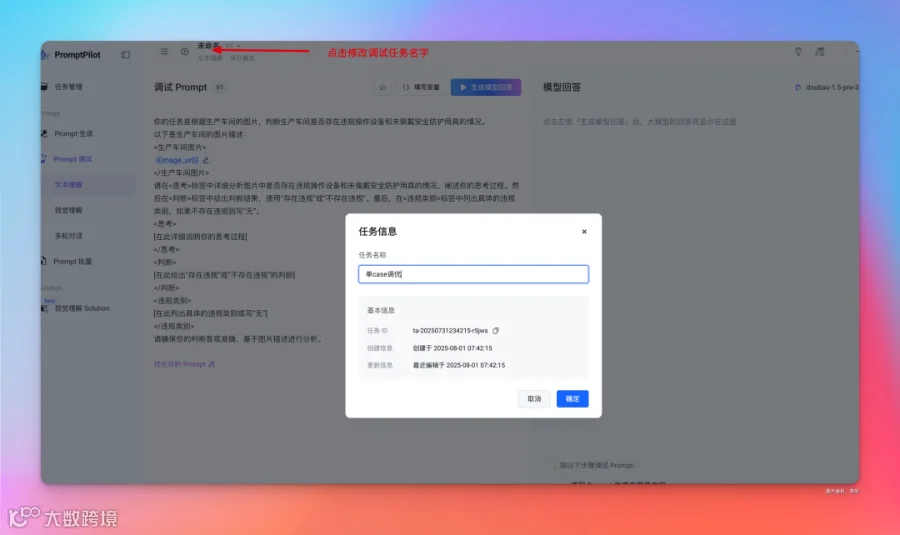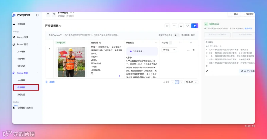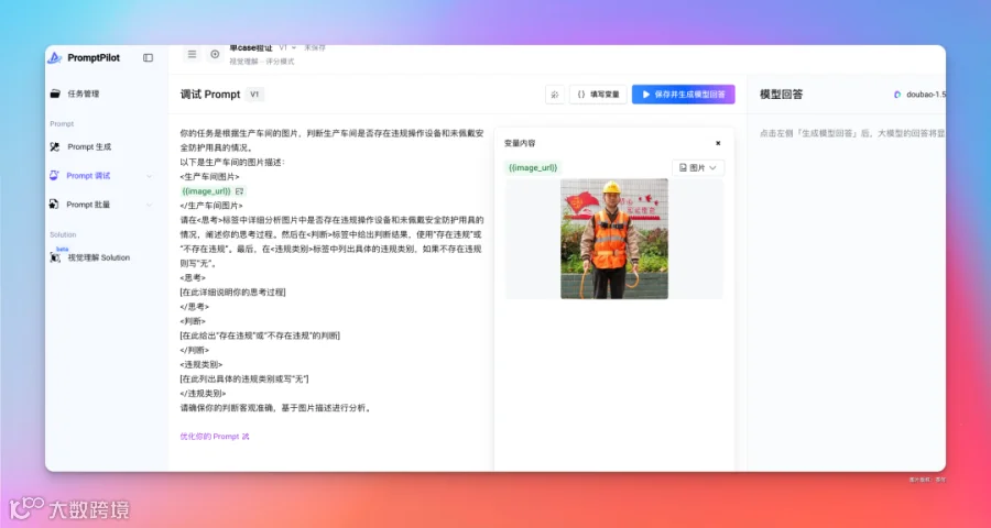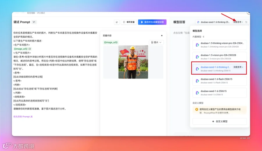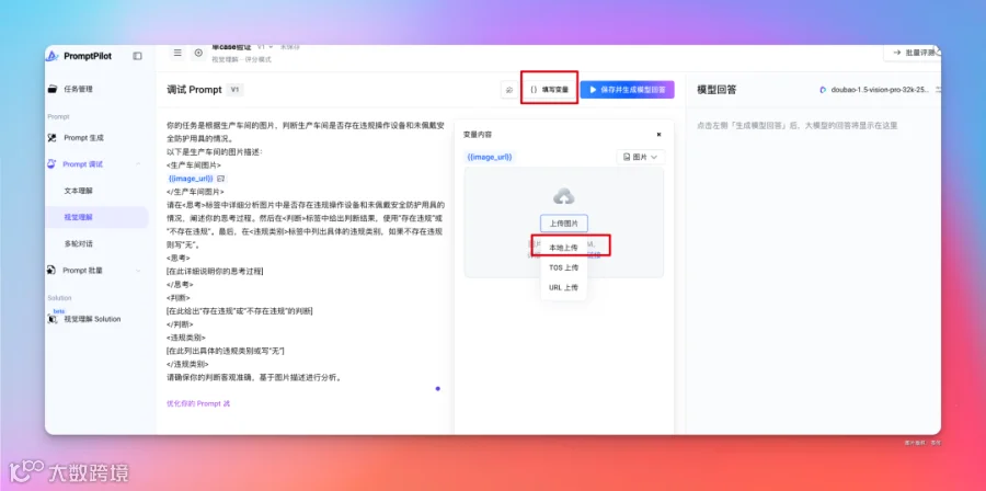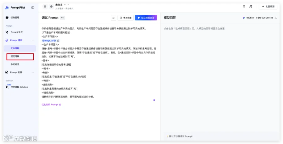 好,接下来,就可以对这个 Prompt 进行调试了,因为是一个图片理解任务,在 Prompt 调试这需要选择对应的视觉理解。