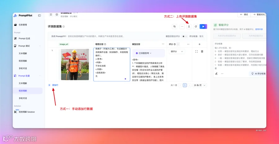 但很多时候,我们需要大量的评测数据对提示词进行批量评测,在 PromptPilot 中就可以 togethe 通过添加行或者上传评测数据的方式。