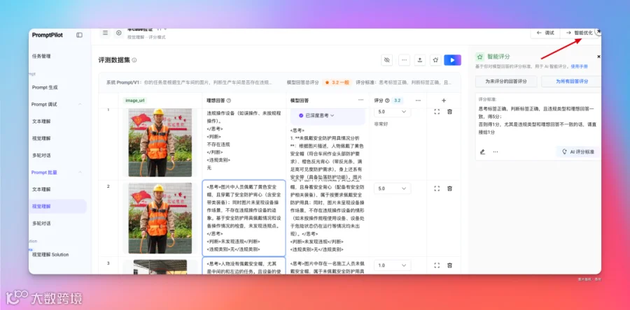 到这里,批量评测相关数据集都准备好了,然后选择「智能优化」,基于批量调试的数据集,进行提示词优化。