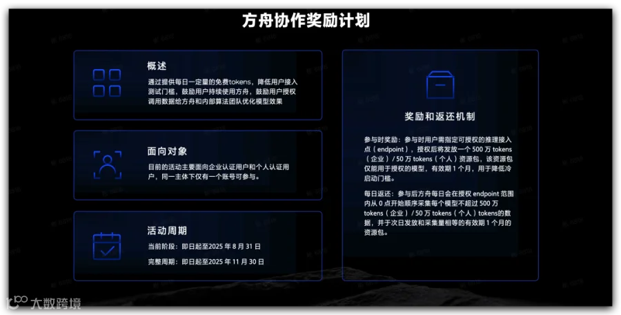 这次还有个重磅消息,火山方舟正式开启协作奖励计划,通过提供每日一定量的免费tokens,降低用户接入测试门槛,鼓励用户持续使用方舟,鼓励用户授权调用数据给方舟和内部算法团队优化模型效果奖励和返还机制。目前的活动主要面向企业认证用户和个人认证用户,同一主体下仅有一个账号可参与。