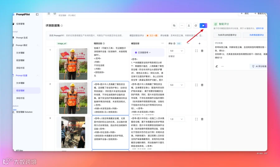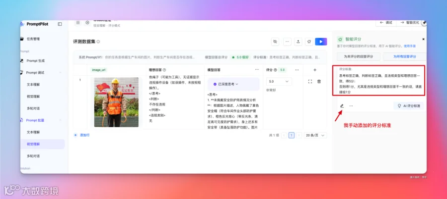 在右侧还可以添加评分标准,或者让 AI 自动生成评分标准(不过需要先手动评分至少 3 个数据集,AI 才能揣摩你的评分标准是啥)。