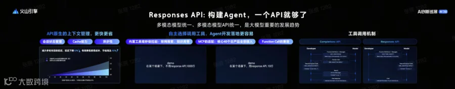 还推出了 Responses API,这是火山方舟平台的 API 体系升级,降低 API 成本和开发难度,能自主选择调用工具,解决复杂 Agent 任务。