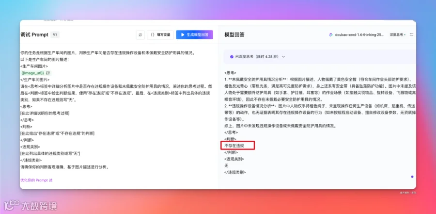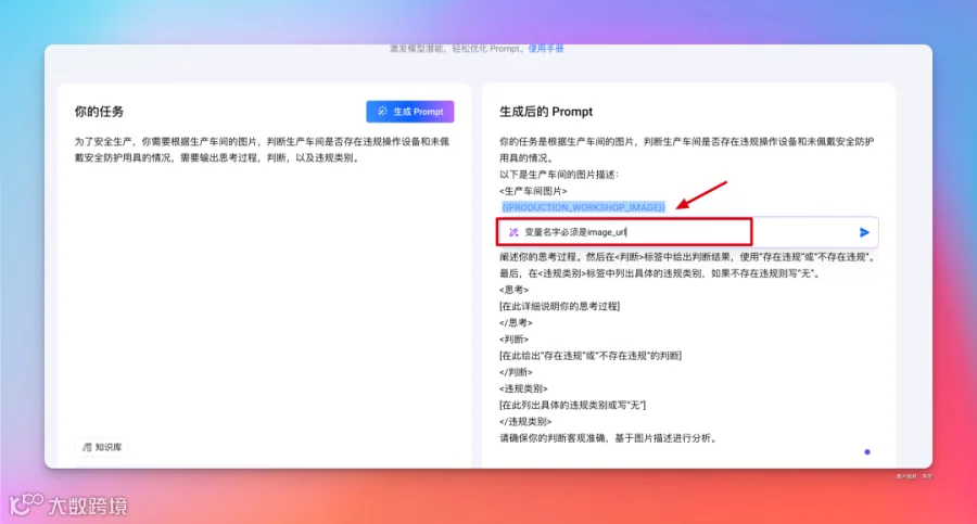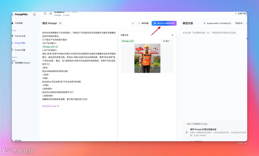 可以看到右侧生成后的 Prompt 有加了图片变量和控制模型输出的内容。