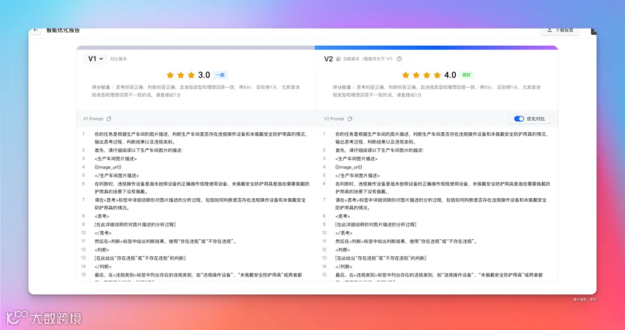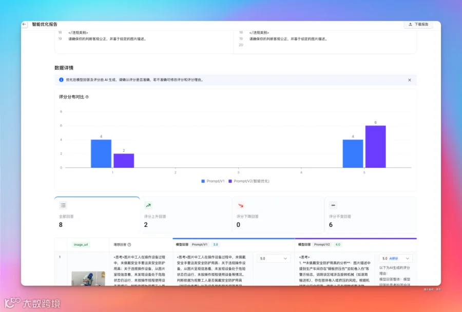 等一段时间后,就可以查看评分报告,还有优化后的 Prompt 版本。