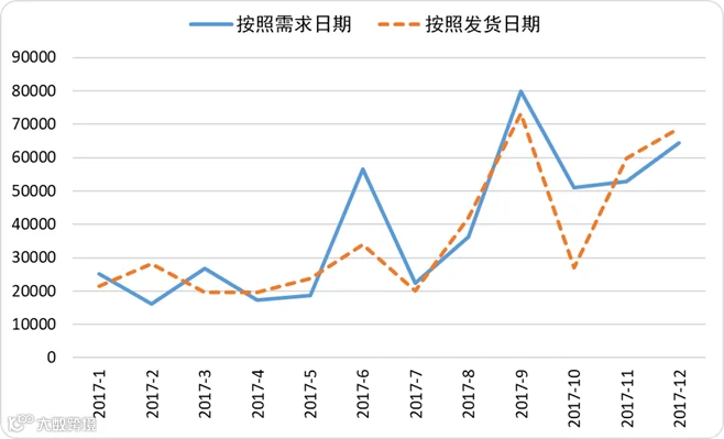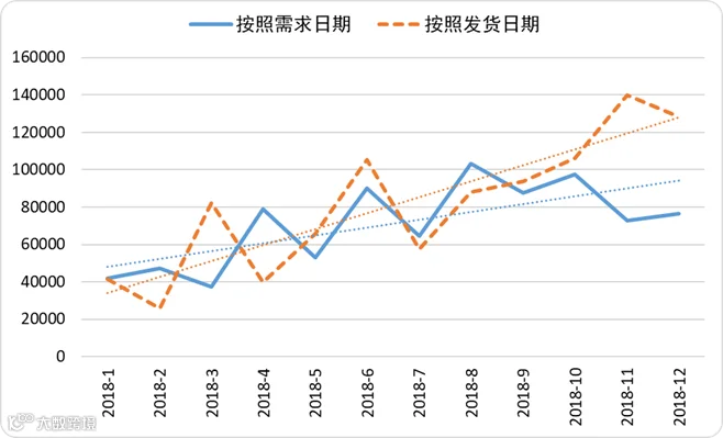 这是一位读者分享的数据。如图1,我们用两种方式来识别需求:一种是按照客户需求日期(简称需求),另一种是按照实际发货日期(简称发货)。