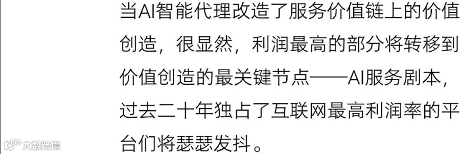 当AI智能代理改造了服务价值链上的价值创造,很显然,利润最高的部分将转移到价值创造的最关键节点——AI服务剧本。从这个预测出发,过去二十年独占了互联网最高利润率的平台们将瑟瑟发抖。例如,传统上携程是典型的平台型商业模式:连接供给方(航司、酒店、景区等)与需求方(用户),通过信息聚合、比价、交易撮合和服务保障获取佣金和服务费,以轻资产模式占取了旅游服务价值业的高端位置。而在A2A经济中,平台上的人类用户和服务商,都可能由AI代理代表参与决策与交易。这意味着:用户的AI代理自动制定出行计划、筛选方案、下单并处理售后;酒店、航司等商家通过AI代理自动定价、响应询问、管理房态和运力;携程则不再是唯一的交易撮合者,这对其商业模式提出了根本性挑战与重构的机会。
