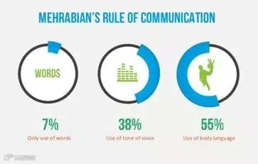 人与人之间的讯息传递=7%言语+38%语气+55%表情,这就是著名的麦拉宾法则。