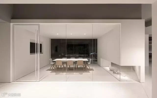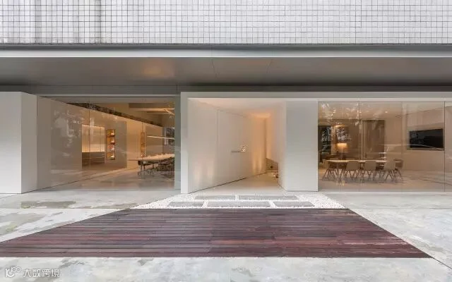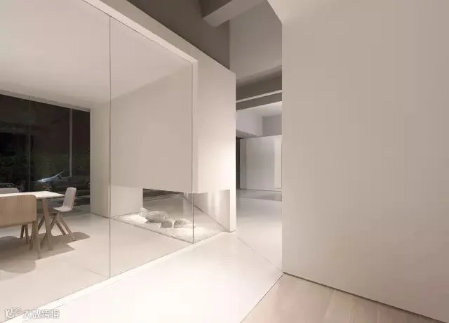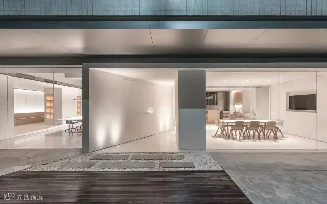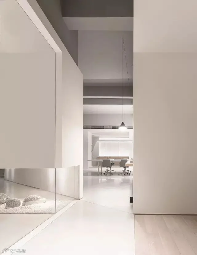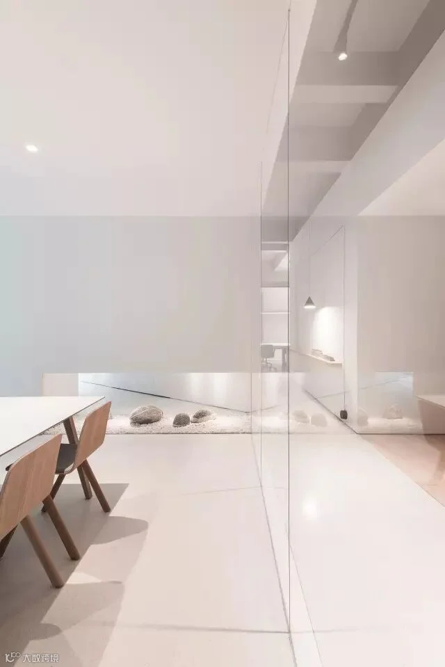 同样的手法也应用于办公空间入口,三角形门厅的底部留空而成一个静谧的禅意山水,它不但是内部办公的景观焦点,也在视觉上将室内外空间连接。