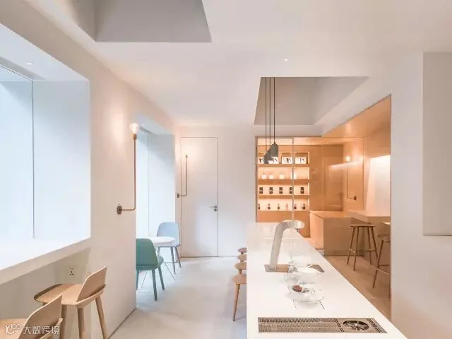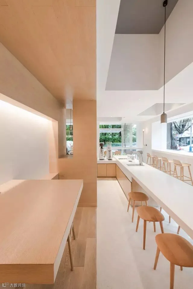 根据对功能需求和周边环境的细致推敲,芝作室在体块里外“雕刻”出不同的开口与凹凸。大的开口将咖啡厅里外贯通,并将窗外绿景框出。在室内,局部挖空的天花板与木饰面壁龛营造出亲近舒适的气氛。