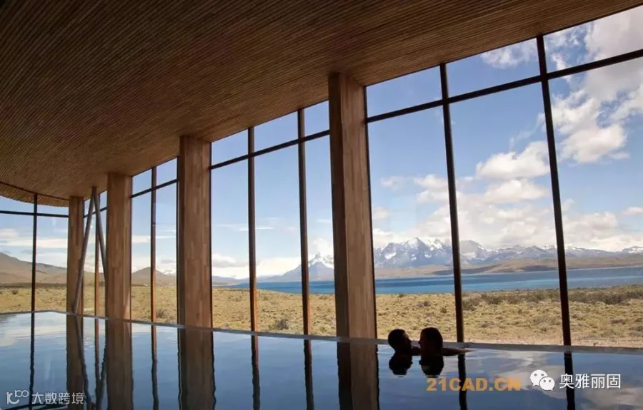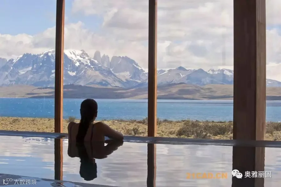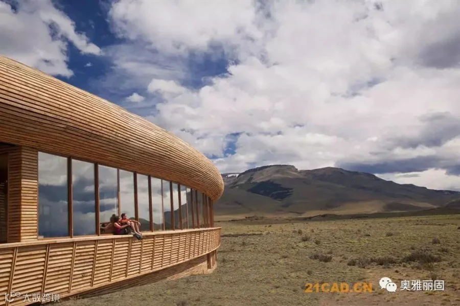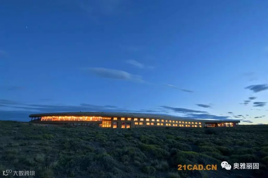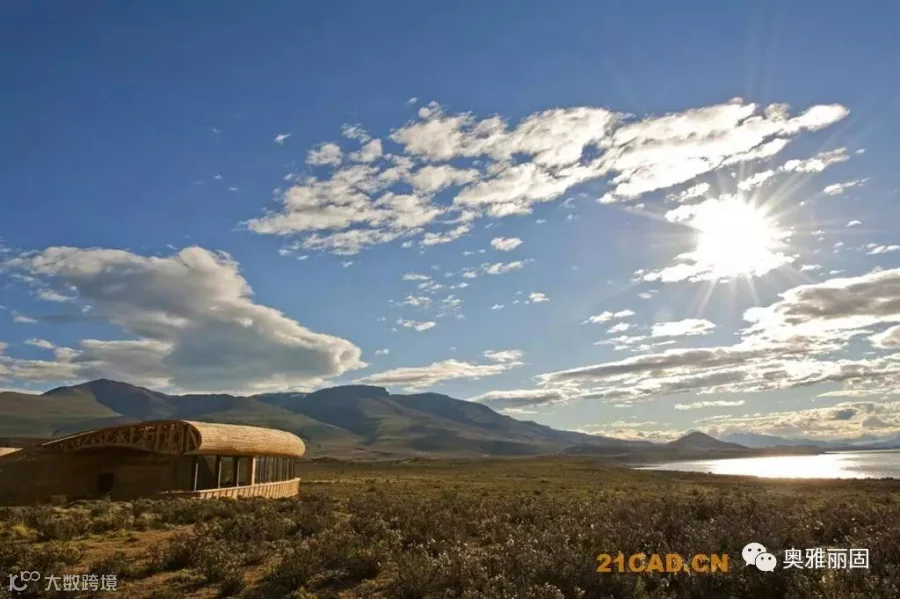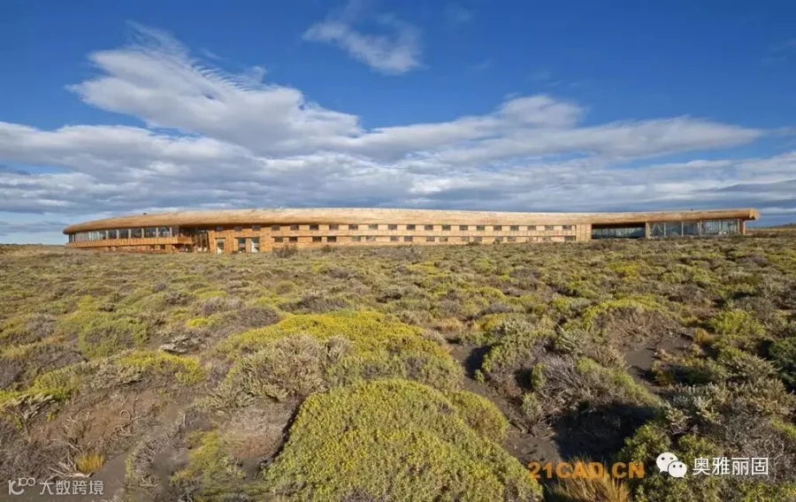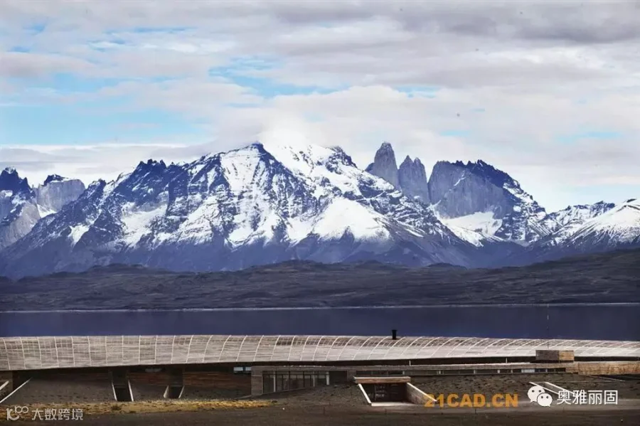 酒店位于智利Torres del Paine国家公园的入口附近,面对萨米恩托湖。萨米恩托湖是这片区域的璀璨明珠,湖对面是深远巍峨的山峦。酒店谦虚的融入现场环境,就如湖边长存的史前动物远古化石。酒店与场地的斜坡融于一体,覆盖上水洗木板,在阳光下闪耀着银色光泽。酒店内部有着温暖舒适的空间,泳池,餐厅,客房均面对着美丽的山景。客人们在酒店里面安心休息,享受自然,也能到野外进行骑马,登山,野驾等等活动。