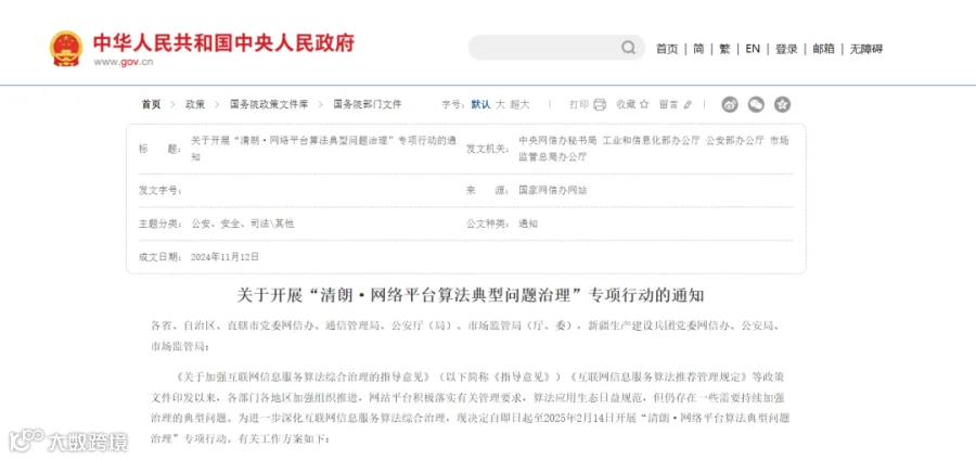 中央网信办、工信部、公安部、市场监管总局四部门联合发文,开展“清朗·网络平台算法典型问题治理”专项行动。