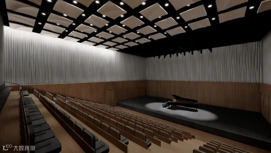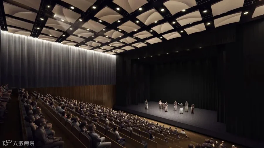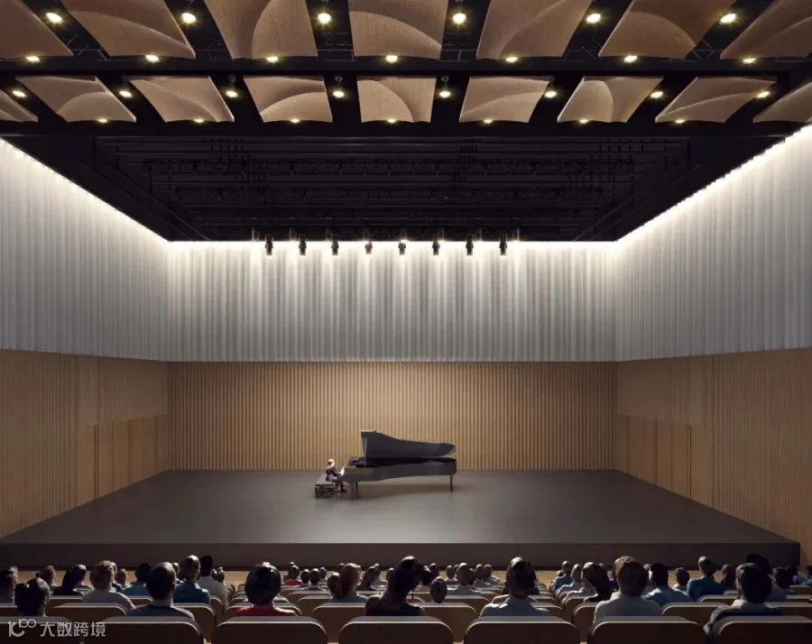 剧场整体面积约为1400平方米,配置有主剧场、排练厅等。剧场室内以木色、暖色调为主,打造温暖柔和的空间氛围。吊顶则是采用了木饰面穿孔铝塑板和54块木色UHPC弧形反声板,起到吸声作用的同时降低前厅的杂音,给观众进入剧场前带来自然柔和的舒适感。