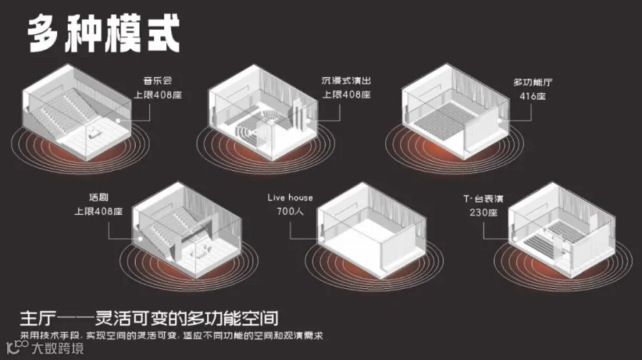 为了让不同类型的优质演出都能在这里有最好的呈现方式,广州云幕剧场把剧场做成了“百变空间”,主厅通过伸缩座椅、活动舞台、悬挂幕布等技术手段实现空间的灵活可变,戏剧、livehouse、舞蹈剧场、脱口秀等各种形式的演出都可以实现。配备完整的、且具有可变性的设备,满足不同剧场演出类型的效果需求。排练厅区域可满足小型工作坊、读剧会、分享会、课程等活动需求,成就每一次的高质量艺术体验。