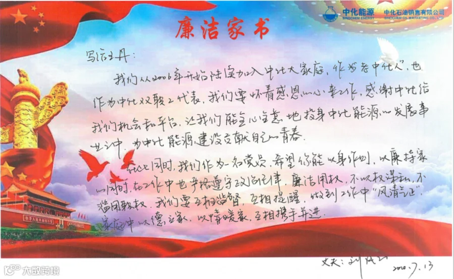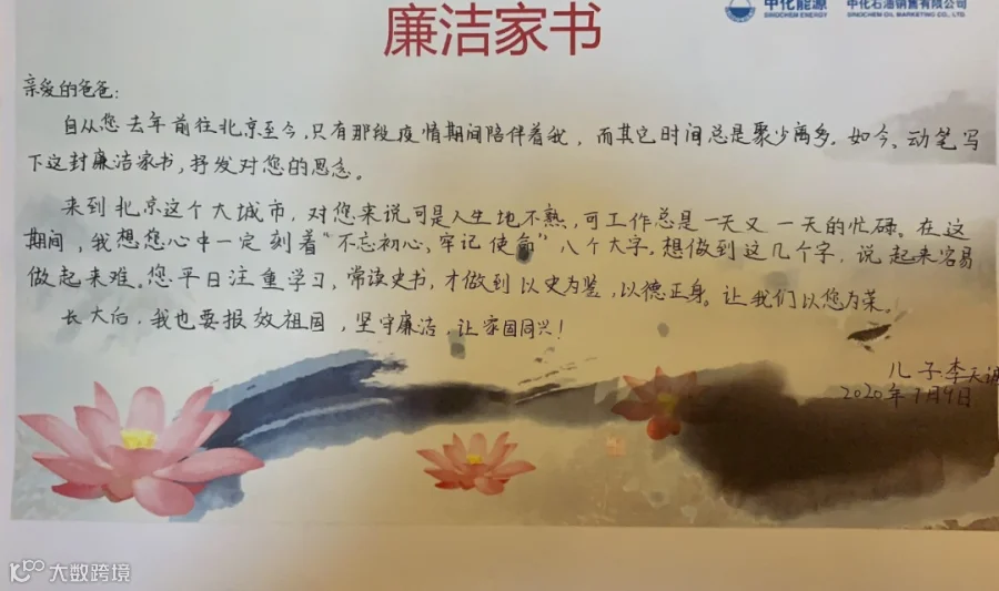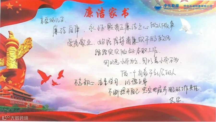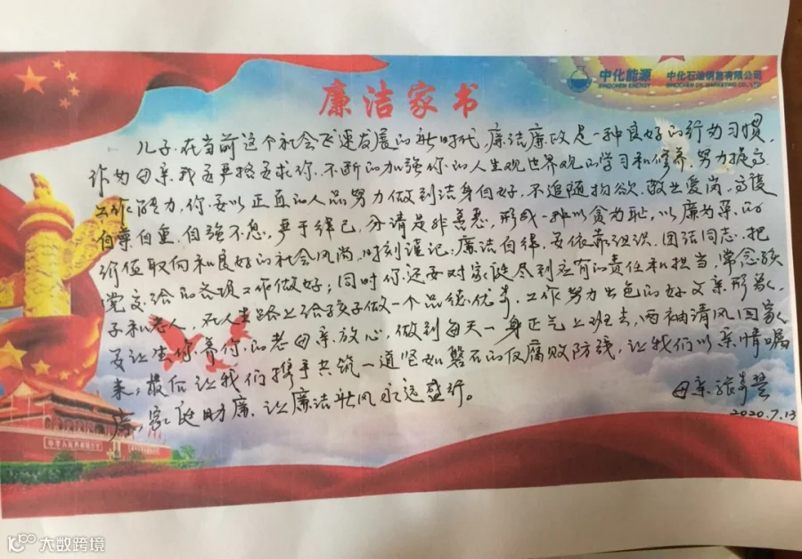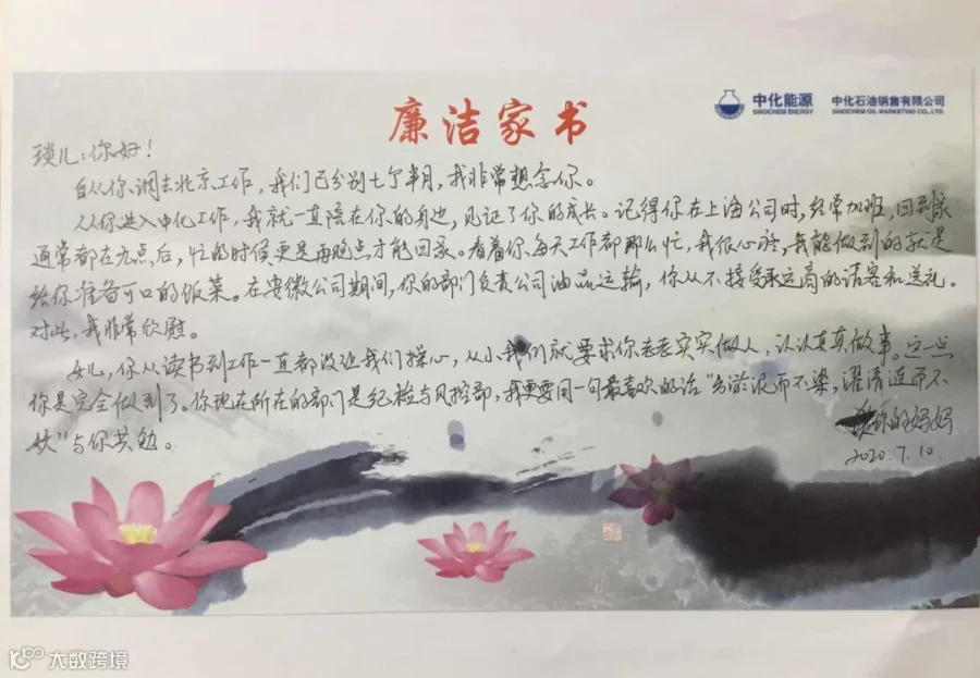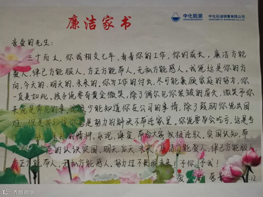 家庭是亲情维系、道德养成、文化价值观念传承和家庭成员健康成长的重要载体,为进一步弘扬中华民族传统文化及传统家风家训,大区公司在全体干部职工及其家庭中开展“廉洁家书”活动,此次活动倡议干部职工家属常吹家庭廉政风,常做家庭廉内助,常念家庭廉洁经,做修身齐家、甘于奉献、甘于清贫的廉内助。