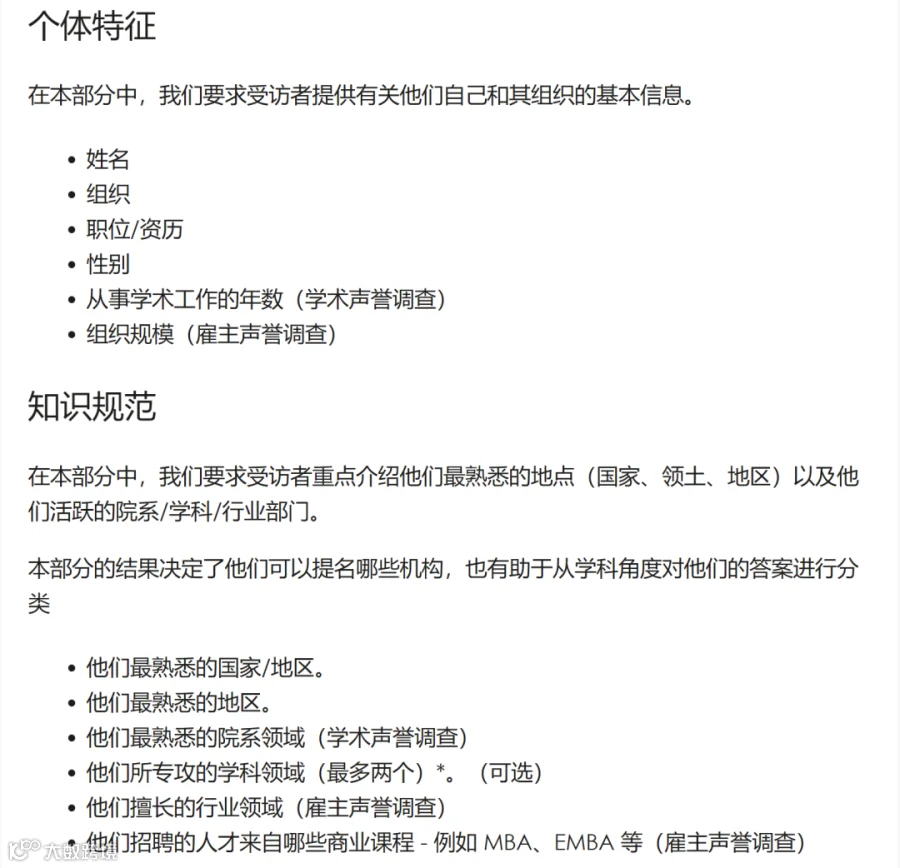 教员学生数量比,你可能还可以通过调查找到数据。但什么是学术声誉?什么是雇主声誉?这些指标,机构还得定出更细的规则给到学校。