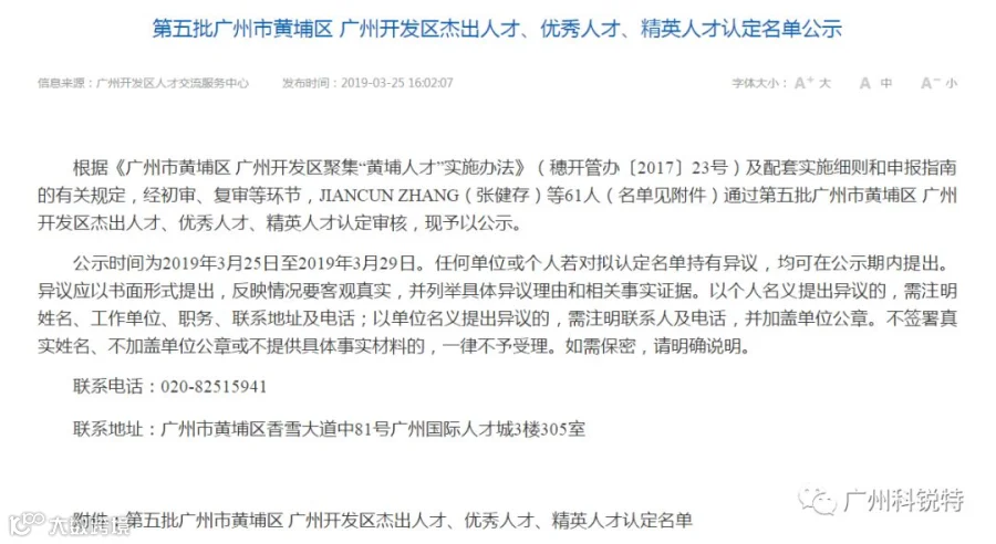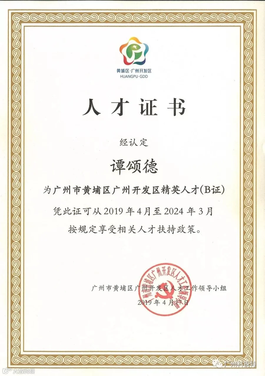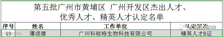 在历经申报、审核、公示等多项严格公正的认定程序后,广州科锐特生物科技有限公司总经理谭颂德荣获2019年第五批广州市黄埔区广州开发区精英人才B证。