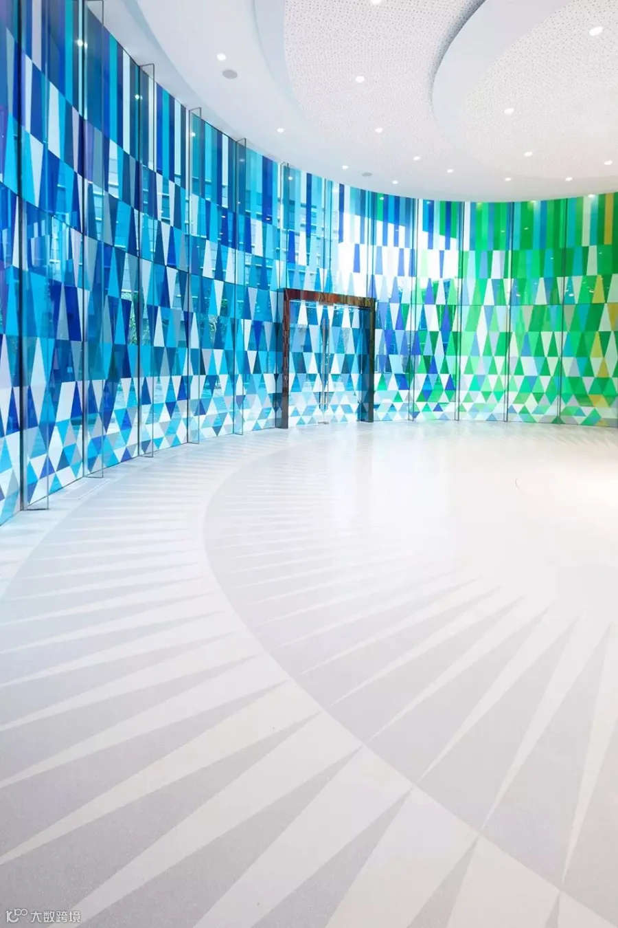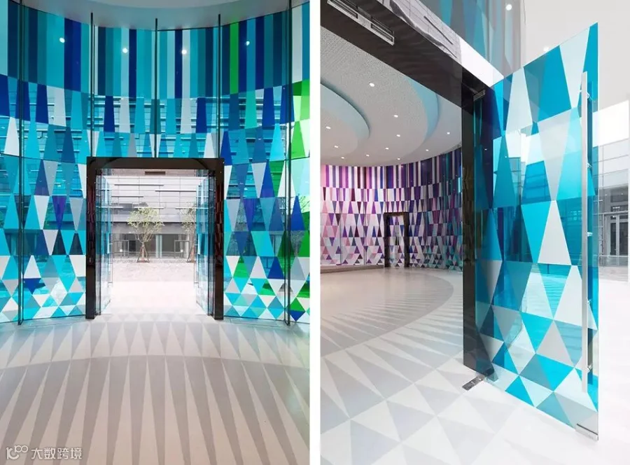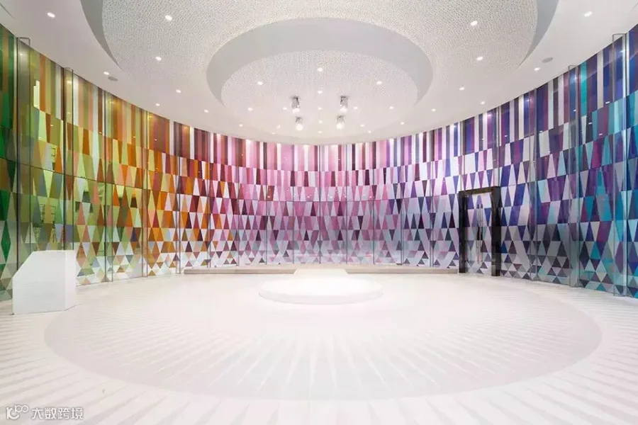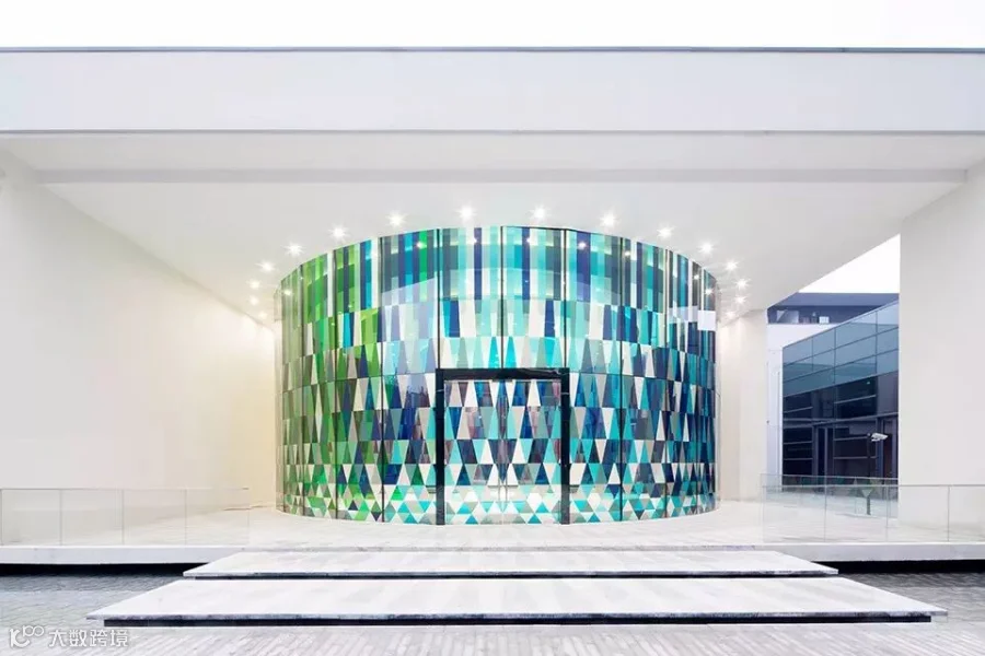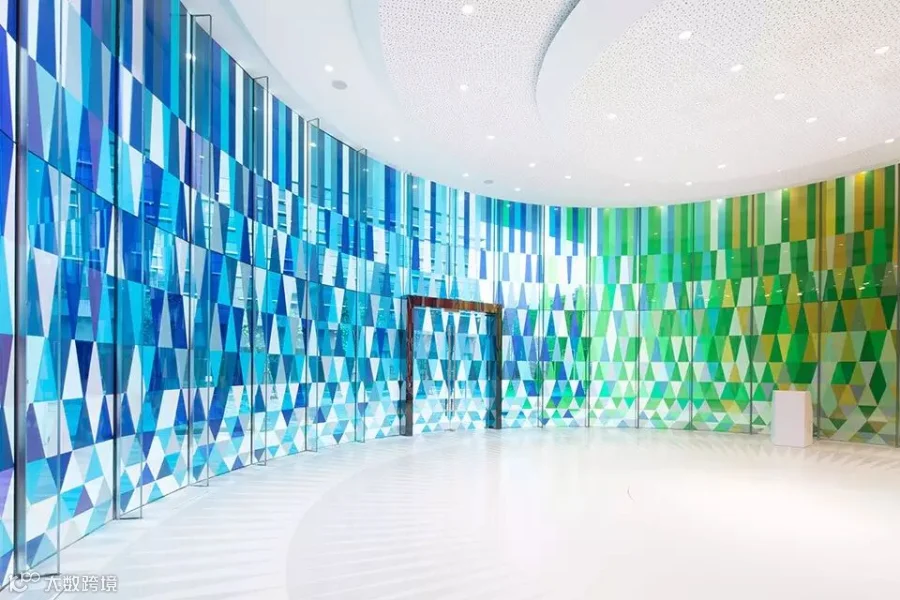 玻璃的无尽可能再一次经探索,凝固于爱庐彩虹礼堂的设计之中-一个约300平米的圆形婚庆场地,由多种生动的彩色玻璃幕墙围绕而成,幕墙同时具有透光性,在阳光的照射下营造出离奇玄幻的光影效果,完美地契合了此类庆典的氛围。玻璃幕墙的图案使用了65种不同颜色的色块,分为3060个元素拼接而成,其半透明的6.8米高的万花筒般的圆柱体空间为爱庐彩虹礼堂更增添一抹愉悦灵动的氛围,同时更为整个场所添加一份独特的魅力。