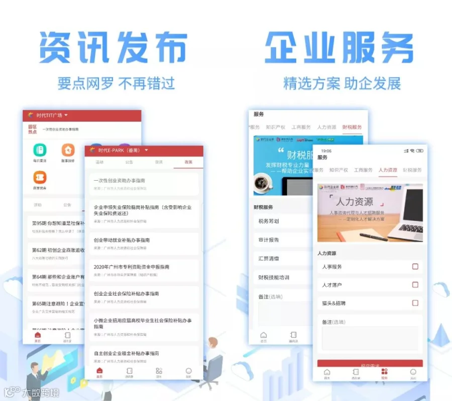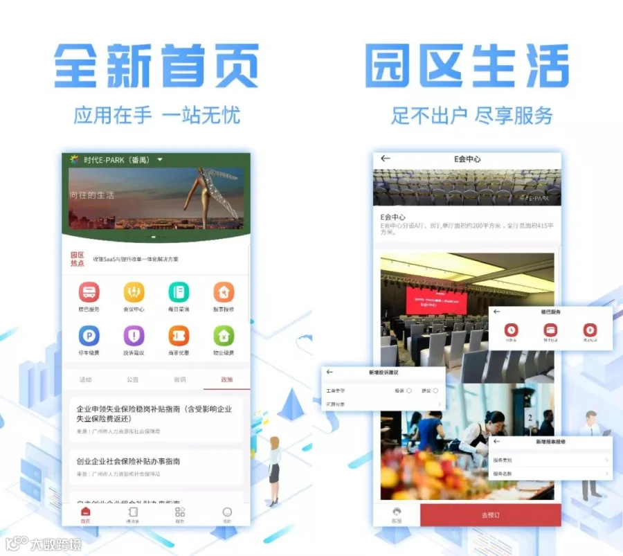 以移动端应用软件为载体,时代企业邦将实现园区服务线上线下一体化,企业管理者及行政人员可在线便捷完成场所预定、物业缴费、报事报修、投诉建议等事务,企业员工可随时在线获取园区最新资讯,享用食堂消费、车位预订、楼巴购票、活动报名等便利服务,更有为园区企业精选的工商政务、法务财税、知识产权、金融人力、政策申报等专业解决方案持续上线,让企业专注成长发展,让员工工作与生活无忧。