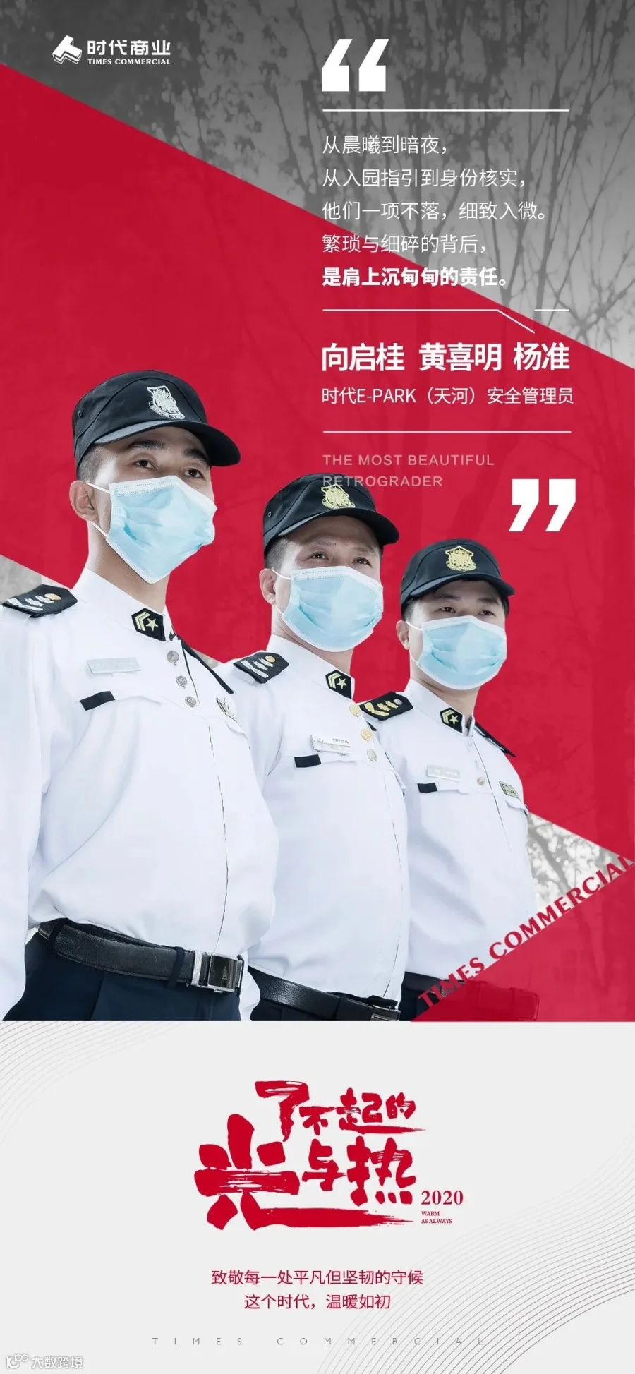 除向启桂等三人以外,时代E-PARK(天河)项目还有16位安管人员为园区的“硬核”防疫共同奋战:当人们因惧怕病毒而闭门不出时,他们不分昼夜地在岗位执勤;当人们谨小慎微地远离人群时,他们重复数百次的抬手测温动作;当人们与家人团聚时,他们在宿舍度过特别的春节······在这场漫长的战役里,哪怕病毒肆虐,时代E-PARK(天河)的安管兄弟始终义无反顾地据守前线,坚强筑起一道道城墙,守护四方清明无恙,保卫园区安定祥和。